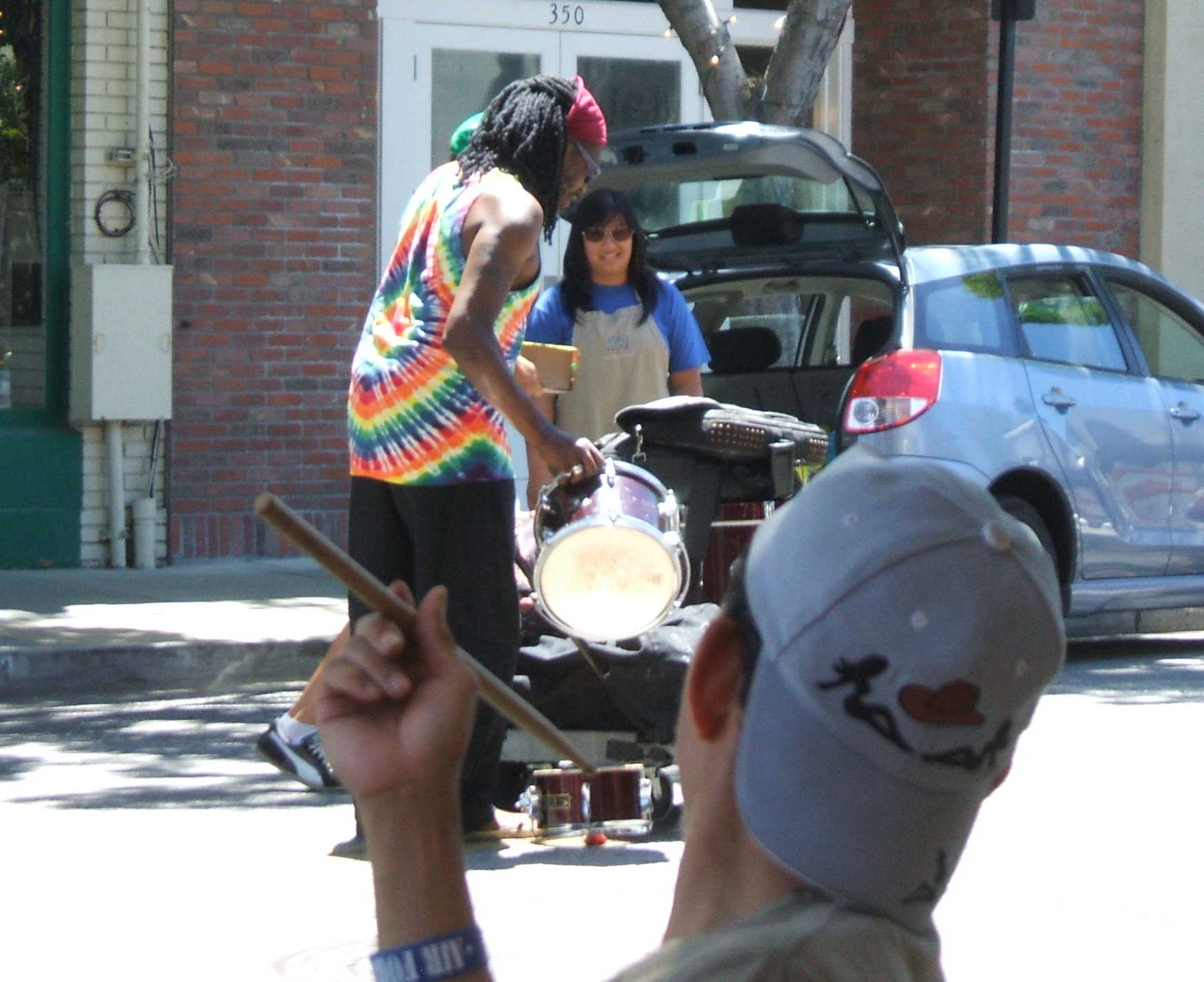 This poor guy was determined to tote all of his equipment, including his farmers market purchases, on top of this one little wagon. His load dropped to the pavement over and over again, snare drum and tom-tom rolling in different directions, until he wisely gave up and made a couple of trips instead of doing it all at once. Until then, he had everyone’s attention (and sympathy).